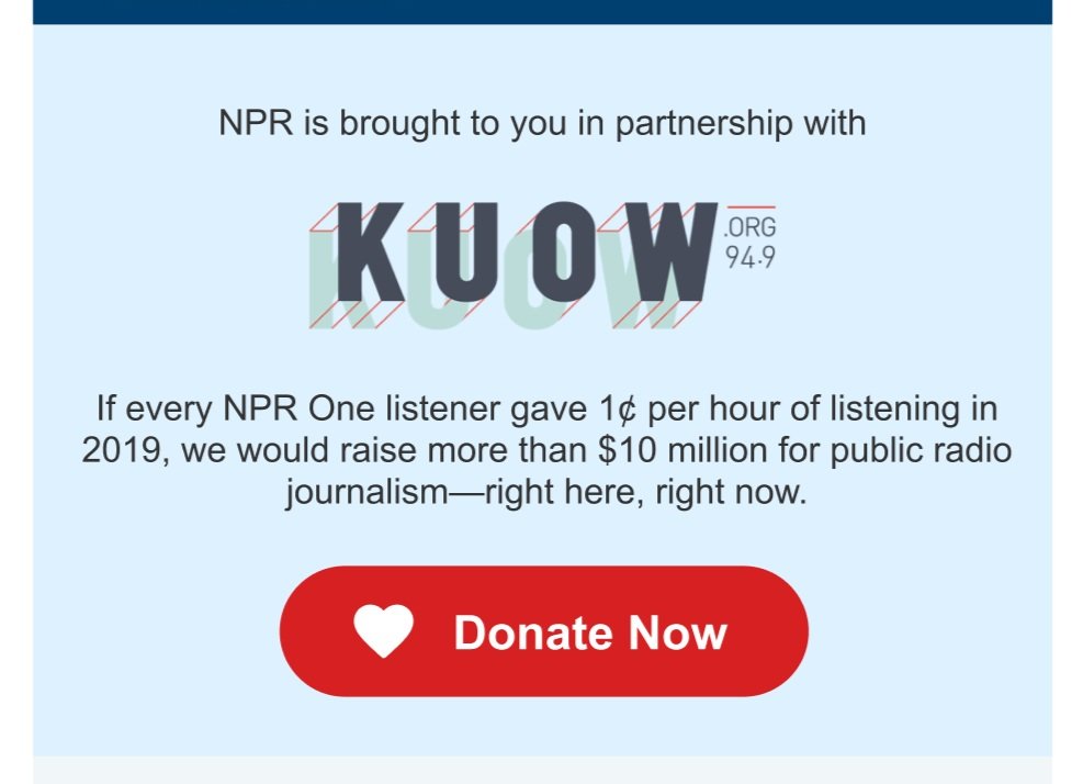 The user’s local NPR station logo is also displayed, along with the message: "If every NPR One listener gave just 1 cent for every minute of listening in the year, we would raise more than $23 million for public radio journalism." The statement is followed by a compelling call-to-action, urging users to donate and share images of their personalized email on social media. This cross-promotion strategy not only encouraged listeners to support their local NPR station but also spread awareness about NPR One and the impact of their donations.